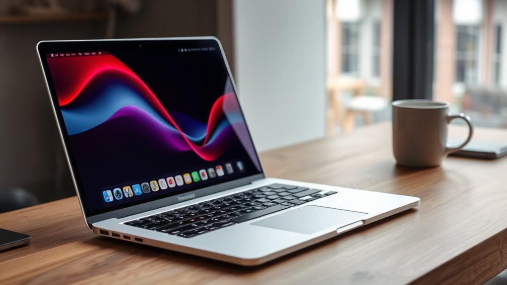 Back in the day, laptops didn’t have fancy cooling systems, but now, these high-performance MacBook Pros feature advanced thermal management. I’ve found they include a combination of efficient heat pipes, vapor chamber technology, and improved airflow to prevent overheating during intense tasks. The fans are smart, adjusting speed automatically to keep temperatures ideal. This means I can push my workload without worrying about thermal throttling affecting my work.