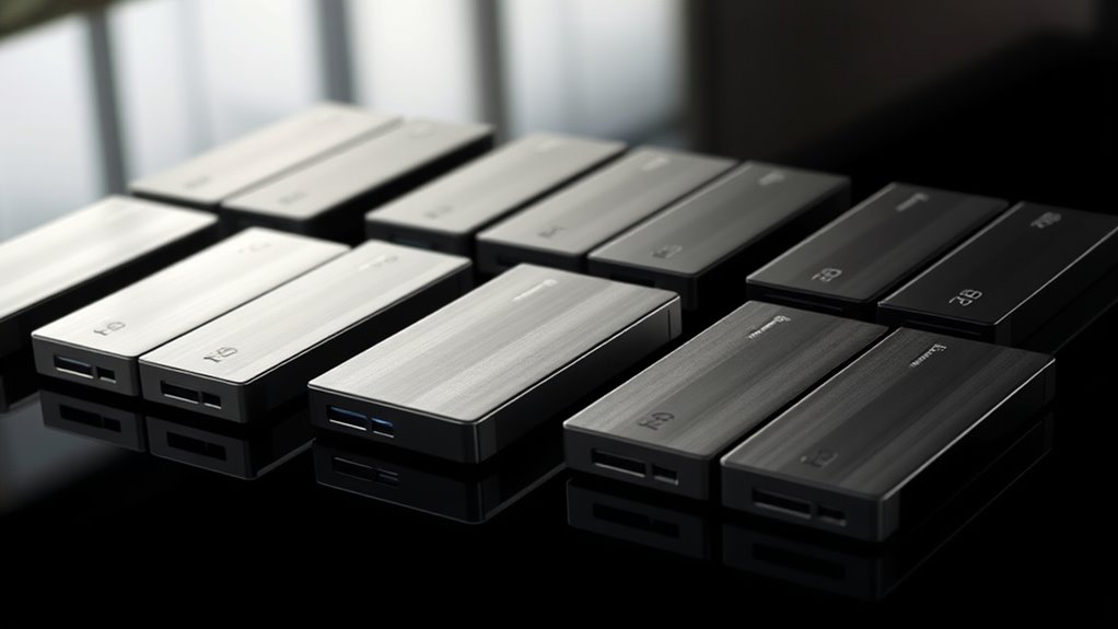 Durability is vital when selecting a portable SSD with hardware encryption, especially if I plan to carry it around frequently or use it outdoors. I look for drives with IP ratings like IP55 or IP65, which guarantee dust and water resistance, so I won’t worry about environmental exposure. Drop resistance is also essential—ideally, the drive should withstand falls from at least 2-3 meters (6-10 feet). Rugged chassis materials like forged aluminum or reinforced rubber not only protect the drive but also act as heatsinks and shock absorbers. Physical protection features such as shock and vibration resistance safeguard my data during intense activities or rough handling. Making sure the drive can handle environmental hazards like dust, water, and temperature changes guarantees reliable performance in any conditions.