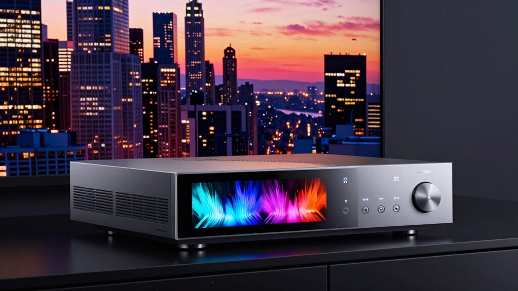 High-quality audio features are essential for creating an immersive home theater experience with a 4K Blu-ray player. Support for high-resolution audio formats like DSD, FLAC, WAV, ALAC, and AIFF guarantees studio-quality sound that audiophiles will appreciate. Immersive formats such as Dolby Atmos and DTS:X deliver surround sound that truly surrounds you, enhancing movie and music enjoyment. Dual HDMI outputs can separate audio and video signals, resulting in clearer, more precise sound. Compatibility with Hi-Res audio playback allows for listening to music with greater detail and depth. Additionally, dedicated high-fidelity circuitry and balanced XLR outputs help reduce noise, providing cleaner sound. These features guarantee that your audio experience matches the stunning visuals delivered by a top-tier 4K Blu-ray player.