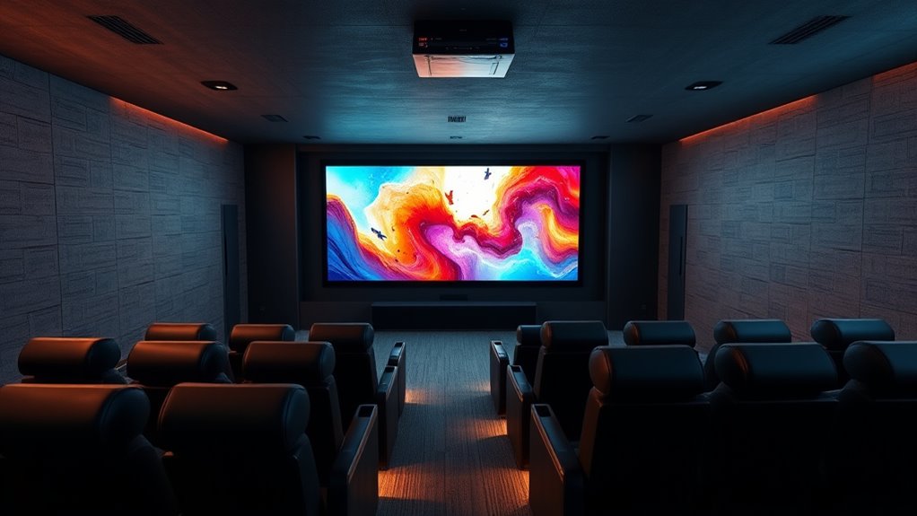 Brightness levels directly influence the overall impact and clarity of your home theater experience. Measured in lumens, higher brightness guarantees the image remains vivid and clear in various lighting conditions. For rooms with controlled lighting, 1500 to 2500 lumens usually suffice, providing sharp, colorful images without overwhelming the space. If your room is well-lit or used outdoors, you’ll want 3000 lumens or more to maintain clarity and vibrancy. However, too much brightness in a small room can cause eye strain and reduce contrast, so balancing lumens with your environment is essential. Ultimately, selecting the right brightness helps deliver a stunning picture while avoiding discomfort, ensuring your viewing experience is immersive and enjoyable.