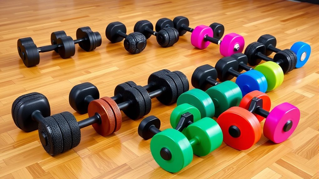 Have you ever struggled with maintaining a firm grip on your dumbbells during intense workouts? The material of the handle plays a vital role in grip comfort. Handles made from knurled steel or high-quality alloy steel with textured surfaces provide a non-slip, secure hold, even when you’re sweaty. Ergonomic handles with contoured or curved shapes help reduce hand fatigue and make extended sessions more comfortable. Non-slip rubber or silicone grips offer a softer feel and extra security, preventing slips during heavy lifts or high-rep sets. Additionally, the handle’s diameter and length matter; most users find handles around 1 to 1.25 inches in diameter ideal for a comfortable grip. Choosing the right material can greatly enhance your workout experience and safety.
