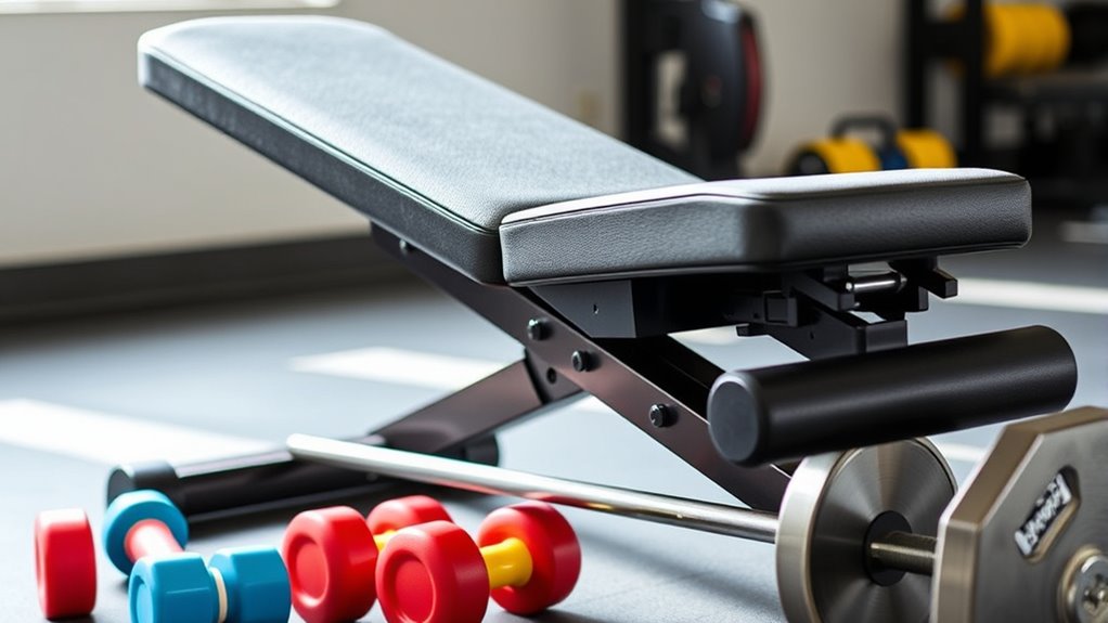 If space is limited in your home gym, choosing an adjustable weight bench that maximizes efficiency becomes essential. Foldable designs can save up to 80% of space when not in use, making them perfect for small areas. Compact models, often less than 35 inches long when folded, can easily slide under beds, sofas, or into closets. Multi-functional benches that combine various exercises reduce the need for multiple pieces of equipment, freeing up valuable space. Quick adjustment mechanisms, like pull pins or ladder systems, allow seamless changes without taking up extra room. Lightweight and foldable benches also make relocating and storing easier, helping you maintain an organized workout environment even in tight spaces. Prioritizing space efficiency guarantees your home gym remains functional and clutter-free.