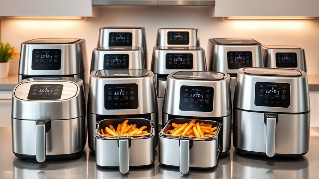 Choosing the right capacity and size for a dual basket air fryer depends on your household’s needs and available counter space. Dual basket models range from 4 to over 10 quarts, affecting how much food you can cook at once. Larger capacities are perfect for big families or entertaining, letting you prepare multiple dishes simultaneously without crowding. If you have limited space, a compact model with a slim profile or stackable design might suit you better. The size of each basket also varies, typically from 3 to 5 quarts, influencing portion sizes and dish types. When choosing, think about your typical meal portions, storage options, and whether the unit fits comfortably on your countertop. Balancing capacity and size ensures your air fryer meets your cooking needs without sacrificing convenience.