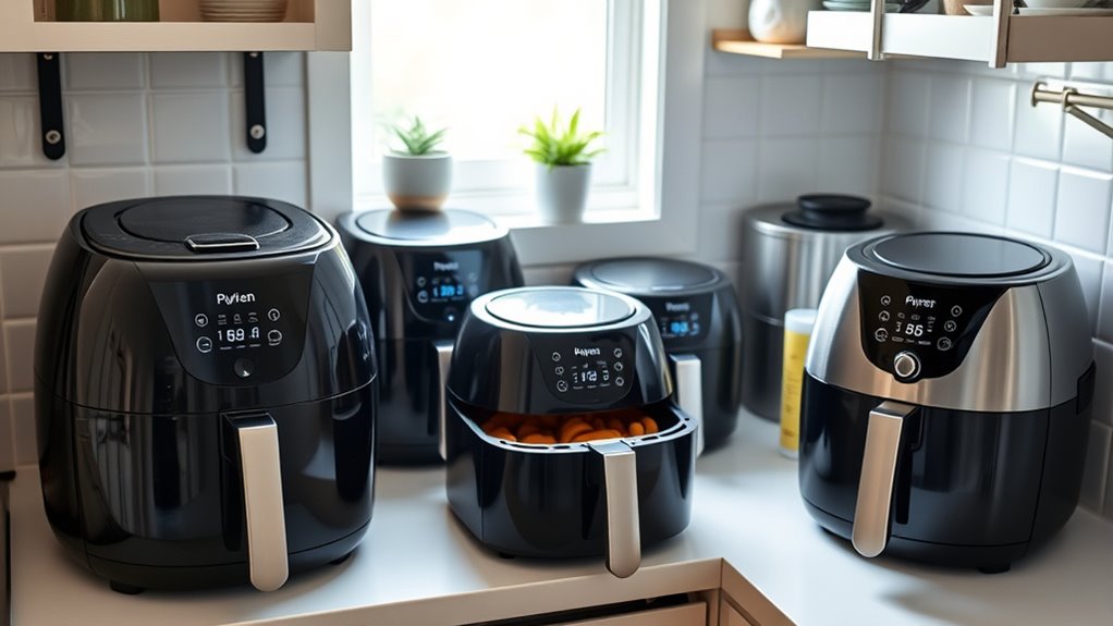 Balancing capacity and space is essential when selecting an air fryer for a small kitchen. Smaller models, usually 2 to 4 quarts, are perfect for single servings or small households, while larger ones, up to 6 quarts, suit families but take up more counter space. Compact air fryers often measure less than 15 inches wide, fitting easily into tight spots without cluttering your countertops. It’s *vital* to assess your typical meal size and cooking needs against your available space. Even smaller models may have a limited basket but can still offer versatile cooking functions suitable for quick snacks or small meals. Prioritizing features like vertical storage or fold-up designs can help maximize your limited countertop real estate while ensuring you have enough capacity for your daily cooking routines.