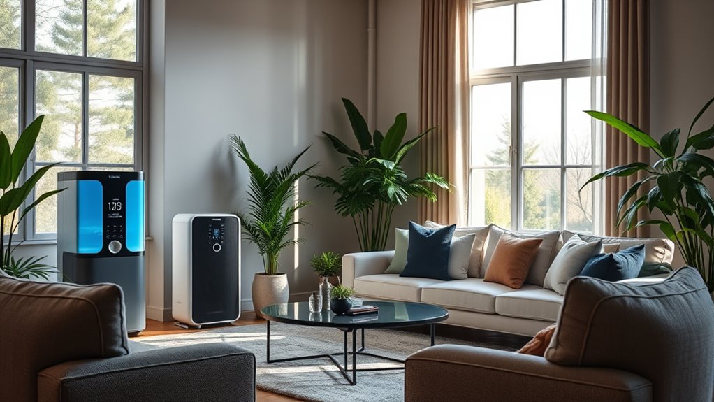 Smart control features have become essential when selecting air purifiers for allergies, as they offer convenience and real-time management. With smartphone apps, I can monitor air quality and adjust settings from anywhere, ensuring ideal conditions without constant manual checks. Many models include scheduling options, so I can set the purifier to run during peak allergy times or when I’m away, saving energy. Voice assistant integration with Alexa or Google Assistant makes control hands-free, which is especially helpful when I’m busy or multitasking. Real-time sensors provide instant feedback on air quality, prompting automatic adjustments to fan speeds for the best allergen removal. Additionally, smart features like filter life indicators and maintenance reminders help me stay on top of upkeep, ensuring consistent allergy relief and device performance.