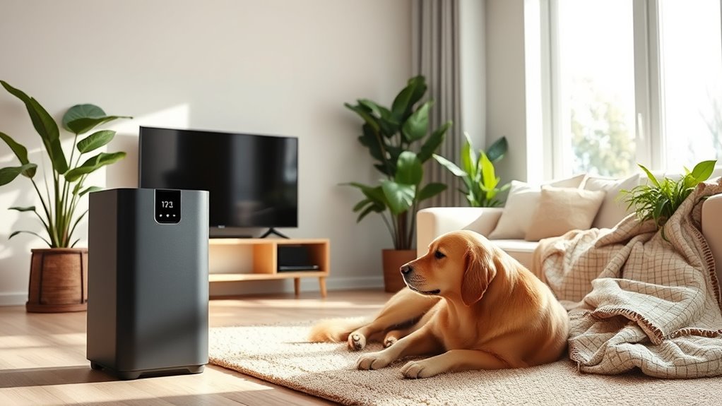 Choosing an air purifier for your pet’s needs hinges on its filtration effectiveness, which directly impacts indoor air quality. HEPA filters are essential because they capture 99.97% of airborne particles as tiny as 0.3 microns, including pet dander, hair, and allergens. Activated carbon filters also play a vital role by removing pet odors, fumes, and VOCs, keeping your home smelling fresh. Multi-stage systems that combine pre-filters, HEPA filters, and activated carbon layers offer comprehensive removal of pet-related pollutants. It’s important to note that filtration efficiency is typically tested and rated by independent organizations, ensuring reliability. Regularly replacing or cleaning filters is crucial to maintaining optimal filtration performance and keeping airborne pet allergens at bay.