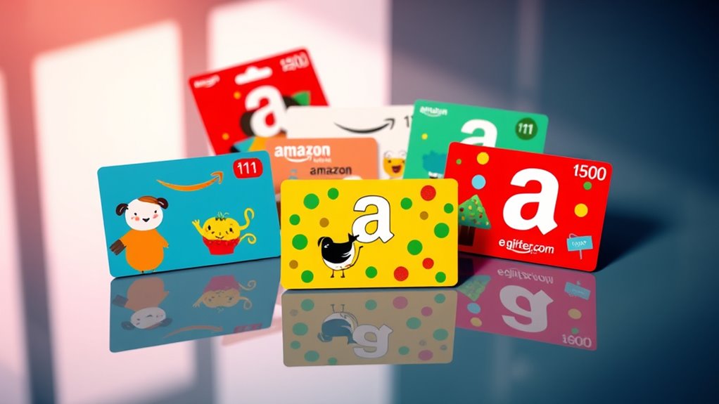 Age-appropriate amusing Amazon e-gift cards are available, ensuring everyone from kiddos to seniors gets a giggle. I’ve seen playful puns for youngsters, cheeky jokes for teens, and clever caricatures for adults. Whether it’s silly stickers, humorous humor, or lighthearted lyrics, these designs delight diverse demographics. So, you can confidently choose funny, fitting gift cards tailored to any age, making gift-giving both thoughtful and fun.