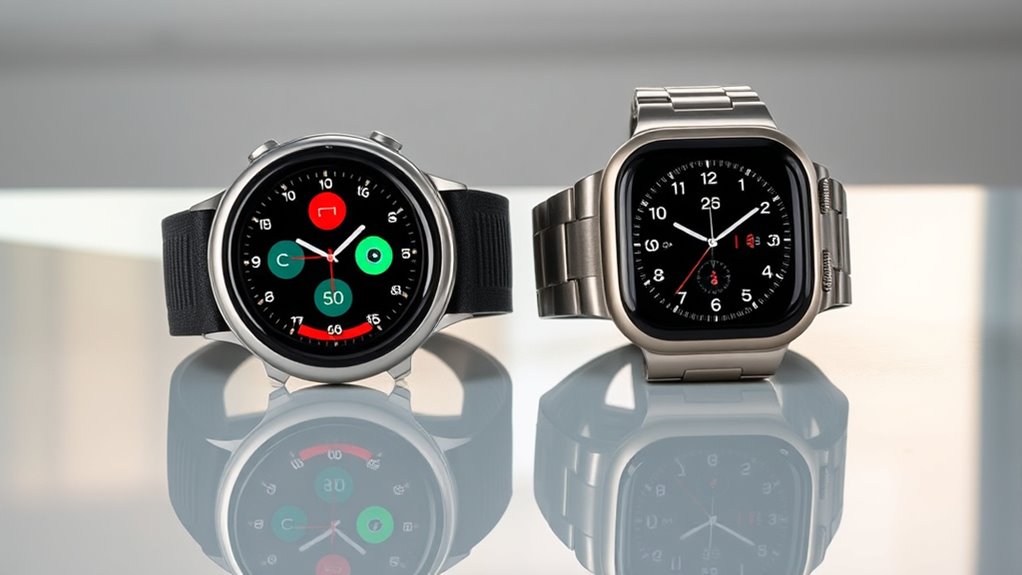 Choosing between the Apple Watch Series 11 and Ultra 3 hinges substantially on their design and durability features. The Series 11 offers a sleek, lightweight build with aluminum or titanium cases, emphasizing everyday comfort. Its scratch-resistant glass and dust resistance make it durable enough for daily use. In contrast, the Ultra 3 is built for ruggedness, featuring a reinforced titanium case designed to withstand extreme conditions. It’s water-resistant up to 100 meters and has reinforced edges to handle impacts. The Ultra 3 also includes specialized bands, like the Alpine Loop and Trail Loop, suited for outdoor adventures. While both models are corrosion-resistant, the Ultra 3 is clearly engineered for more severe environments. Your choice depends on whether you prioritize a stylish, lightweight design or rugged durability for outdoor activities.
