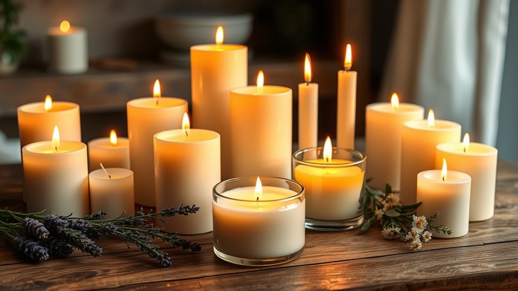 I believe natural fragrances are like a gentle breeze whispering calm into your soul, making them better for stress relief. They’re crafted from real plant extracts, offering pure, authentic scents that resonate with your senses. Synthetic fragrances can sometimes feel like a fog, masking the true aroma and possibly causing irritation. If you’re after genuine relaxation, natural candles are your best bet—they’re like a soothing hug from nature herself.