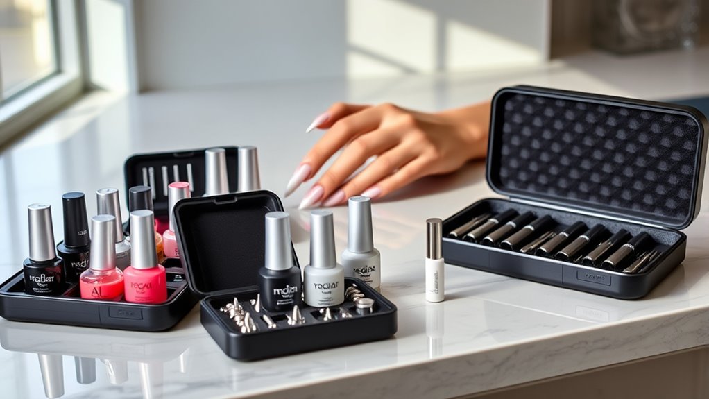 Safety features are vital to guarantee that at-home gel manicures are both effective and secure. Look for nail drills with overload protection and automatic shut-off to prevent overheating, which can cause burns or damage. Adjustable speed controls and reverse functions help minimize nail damage and reduce injury risk. Choose kits that generate low heat and vibration to lessen discomfort and skin irritation during longer sessions. Safety accessories like dust-proof caps, bit guards, and sturdy, non-slip handpieces ensure secure handling and prevent accidents. Clear, easy-to-use controls, such as LCD displays or visual cues, help maintain safe operation and avoid user error. Prioritizing these features ensures your at-home manicures are not only beautiful but also safe, giving you confidence with every use.