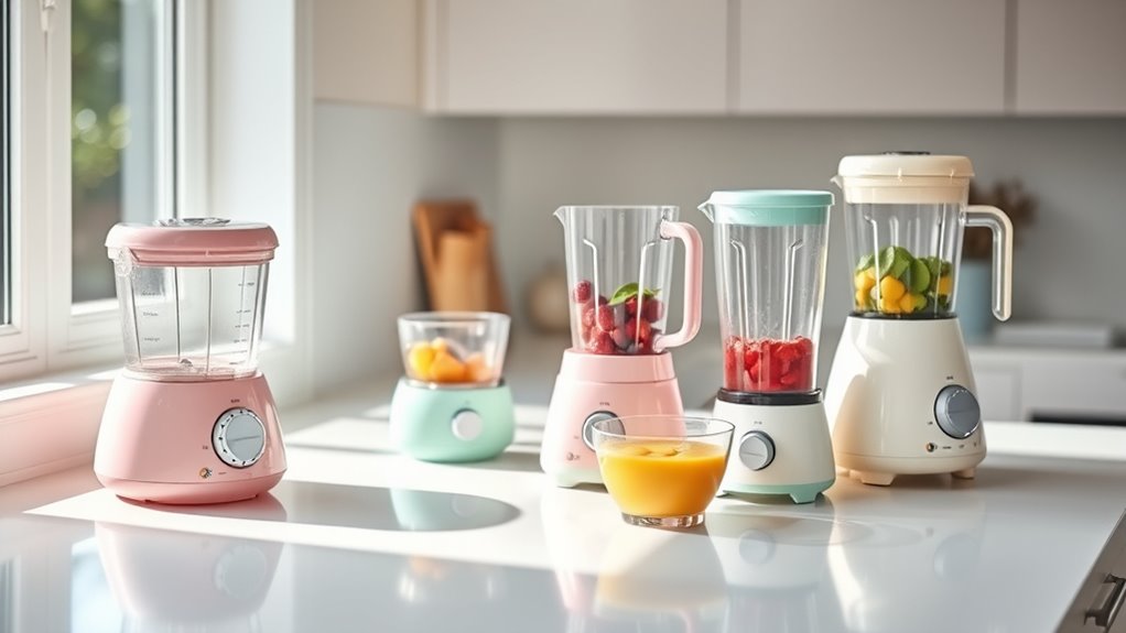 If you’re looking for the best baby food makers and blenders of 2025, I can help! There are great options like all-in-one systems with steaming, blending, and sterilizing features that make meal prep easier and faster. Compact models, sturdy materials, and user-friendly controls guarantee safety and convenience. Whether you want a multipurpose processor or a simple blender, I’ll guide you through the top choices that can simplify your baby’s nutrition routine. Keep going to find the perfect fit for your needs.