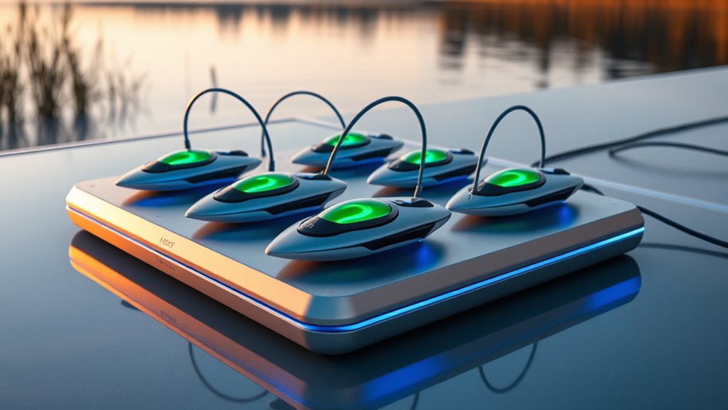 Having multiple port options on a bait boat charging station can considerably improve your fishing experience by allowing you to charge several devices at once. USB and DC power outlets offer versatile compatibility, letting you power bait boats and other electronics without needing extra adapters. The number and type of ports determine whether you can support different bait boat models and accessories simultaneously. Some stations even feature adjustable output levels, so you can match the power to your battery sizes and charging needs efficiently. Port placement and accessibility are vital, especially in outdoor or marine environments—easy-to-reach, secure connections make setup quick and hassle-free. Overall, a station with diverse ports and flexible options ensures you’re always ready for a productive day on the water.