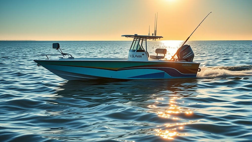 Selecting a bait boat capable of lasting through long saltwater fishing sessions means paying close attention to its power and battery durability. I look for high-capacity batteries, like 12,000mAh or more, to guarantee extended use without frequent recharging. Dual or multiple batteries are a big plus, as they allow hot-swapping, minimizing downtime. I also check that the battery compartments and terminals are corrosion-resistant and waterproof, protecting against saltwater damage. Brushless motors are my go-to because they’re more durable and efficient in harsh conditions, providing reliable power. Ultimately, I prefer boats with low power consumption features and smart battery management systems, helping to optimize energy use and extend operating time. This focus on power and battery durability guarantees I stay out longer and keep my bait in the water.