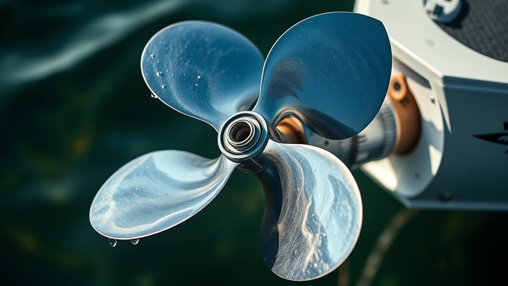 When upgrading your bait boat’s propeller, considering corrosion resistance becomes increasingly important, especially if you fish in saltwater or humid environments. Corrosion-resistant propellers are typically made from materials like stainless steel, nylon, or coated metals that stand up to water and environmental exposure. Features such as anodized or treated surfaces prevent rust and corrosion, directly extending the propeller’s lifespan in challenging conditions. Choosing these materials reduces maintenance and guarantees consistent performance over time. This is especially vital for saltwater fishing, where saline water accelerates corrosion in less protected metals. Regular inspection and cleaning with corrosion-inhibiting solutions can further boost durability. Prioritizing corrosion resistance helps you avoid premature failures and keeps your bait boat running smoothly, no matter where you fish.