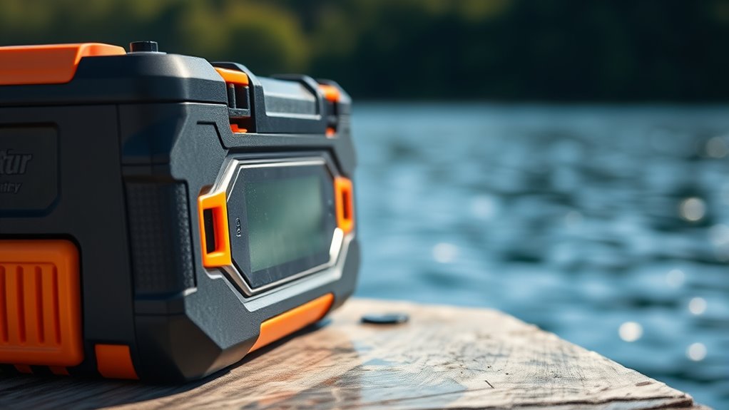 Ensuring safety when selecting spare battery packs is essential to prevent accidents and damage. I look for batteries with built-in protection circuits that guard against over-discharge, over-current, and short circuits. These features help prevent potential hazards and prolong the battery’s life. A Battery Management System (BMS) that monitors voltage and temperature is also necessary; it keeps the battery operating at ideal levels and reduces the risk of overheating. Additionally, I verify that the batteries meet safety standards and certifications, which indicates they’ve been tested for safety risks like leakage or overheating. Regular inspections for physical damage or swelling are critical, as compromised cells can be dangerous during use or charging. Prioritizing these safety features ensures my fishing trips are both enjoyable and safe.