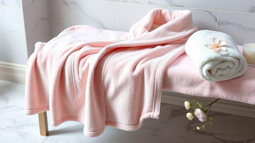 Selecting the right size and fit for a women’s plush bathrobe is essential for comfort and functionality. A proper fit guarantees the robe isn’t too tight or loose, especially around the shoulders and waist. Most robes come with adjustable waist belts or ties, allowing you to customize the fit to your body. It’s important to check the manufacturer’s size chart since sizing can vary between brands and styles. Consider the length of the robe too; longer styles offer more coverage and warmth, while shorter ones provide greater mobility. Also, pay attention to the fit of the sleeves and cuffs—make sure they aren’t too tight or loose so you can move comfortably and layer easily. Finding the right size and fit makes all the difference in enjoying your plush bathrobe.