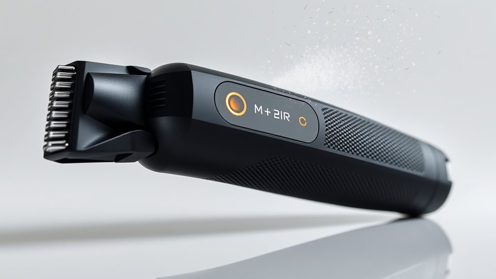 To keep a beard trimmer with vacuum capture functioning at its best, I look for models that are easy to clean and maintain. A sealed, easy-to-empty collection chamber is vital to prevent messes and make cleanup effortless. Removable blades and accessories are a big plus, as they let me thoroughly clean hair and debris buildup. A waterproof design is especially convenient, allowing me to rinse the device under water without worry. Regularly cleaning built-in filters or vents is also essential to maintaining strong suction and peak performance. Plus, having a cleaning brush included helps me reach tricky spots and guarantees hygienic use. Overall, a trimmer with straightforward cleaning features saves time and keeps the device performing at its peak.