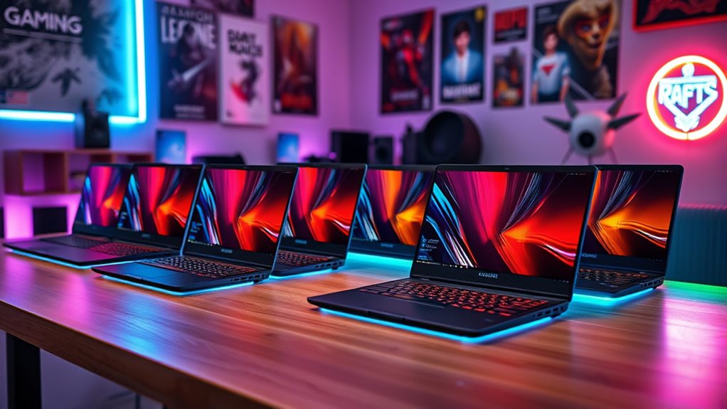 Choosing the right processor for a budget gaming laptop means finding a balance between performance and affordability. I recommend at least a quad-core processor, like an Intel i5 or AMD Ryzen 5, to handle modern games without bottlenecks. Higher clock speeds, such as 3.0 GHz or above, can boost gaming performance, but should be paired with enough cores for multitasking and future-proofing. Mid-range processors with integrated graphics, like Ryzen 5 or Core i5, offer enough power for gaming at lower settings while keeping costs down. It’s best to avoid underpowered CPUs like Celeron or N4000, as they can cause lag and hinder gameplay. Ultimately, balancing processor capabilities with other components like RAM and GPU guarantees a smoother gaming experience within a budget.