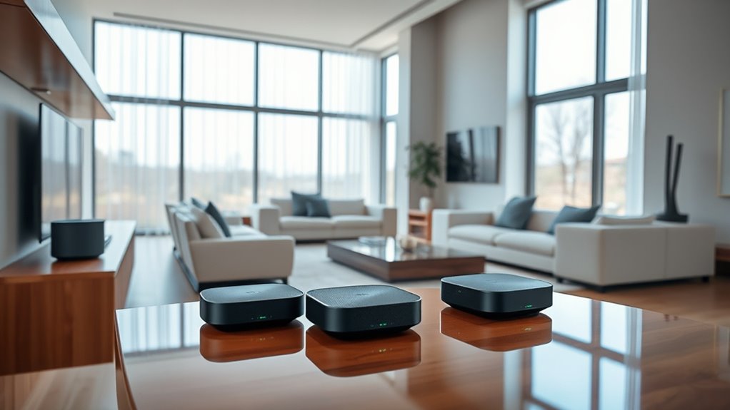 Choosing a mesh WiFi kit that can handle a large house requires careful attention to coverage area. You want a system where each node covers between 2,000 to 3,000 square feet, ensuring full coverage without dead zones. It’s essential to check the total coverage the kit offers—ideally, it should exceed your home’s size to account for obstacles like walls and floors, which can weaken signals. Consider how many nodes are included; more nodes generally mean better coverage and fewer weak spots. Also, see if the system supports adding extra nodes down the line if your needs grow. Planning for these factors helps you select a kit that reliably covers your large space, providing fast, consistent WiFi throughout your home.