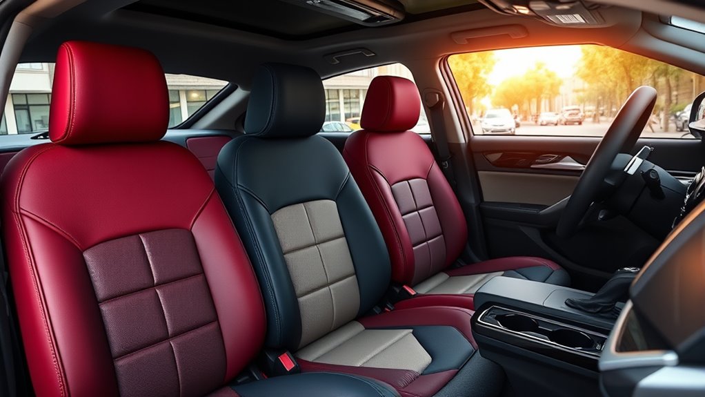 Choosing the right car seat covers involves more than just protection; style and design play a key role in enhancing your vehicle’s interior. With options like luxurious Nappa leather, sporty faux leather, and breathable mesh fabrics, you can easily match your covers to your interior aesthetic. Design choices vary from full-coverage sets that protect entire seats to semi-customized covers targeting specific areas for a tailored look. Many styles feature modern patterns, vibrant colors, or sleek solid tones to boost your vehicle’s appearance and reflect your personality. Some include special stitching or piping accents, like contrast stitches or leather piping, adding visual interest and a premium feel. When choosing, consider how the design complements your seat contours, headrest shapes, and overall decor for a cohesive look.