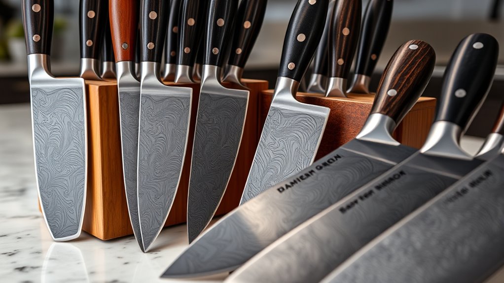 High-quality carbon-steel and Damascus knives are built to last a lifetime, but their longevity depends heavily on proper care. The durability of these knives hinges on the steel’s integrity, with high-carbon and Damascus layers offering resistance to chipping and cracking. Regular maintenance, such as hand washing, oiling, and careful cleaning, is essential to prevent rust and guarantee structural integrity over time. Proper seasoning and periodic re-sharpening are vital to maintain their edge and avoid dullness, which can lead to damage. Knives made from durable steels are designed to withstand frequent use in demanding kitchens without losing their functionality or appearance. When cared for correctly, these knives can truly become lifelong tools that elevate your culinary experience.