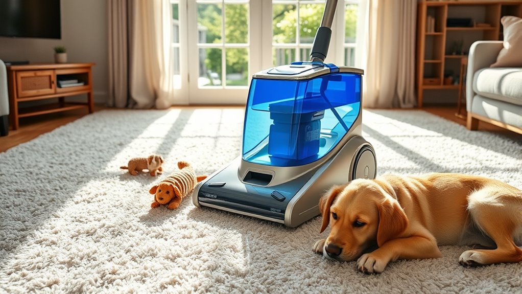 Ensuring your carpet cleaner is safe for pets is essential to protect their health while maintaining a clean home. Look for products labeled as pet-safe, free from harmful chemicals like phosphates, heavy metals, and synthetic fragrances. Bio-enzymatic formulas are a great choice because they break down organic stains and odors without posing health risks to your pets. Opt for units that use non-toxic, biodegradable detergents to reduce exposure to hazardous residues after cleaning. It’s also important to verify that the cleaner is certified by reputable organizations like the Carpet and Rug Institute (CRI), which ensures safety and effectiveness around pets. Finally, avoid cleaners with strong fumes or propellants, as these can irritate your pet’s respiratory system or trigger allergies.