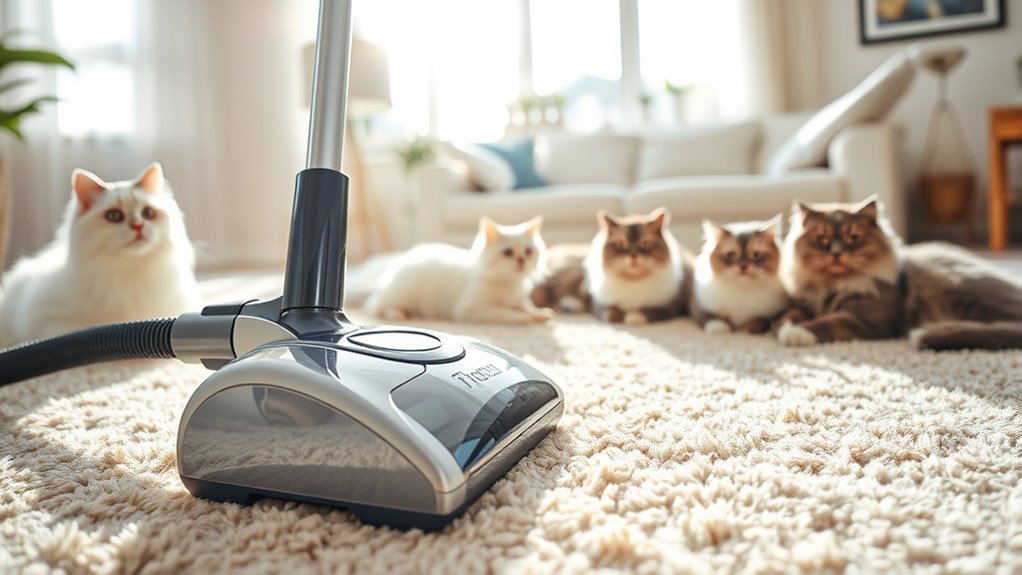 Effective allergen and dander filtration are crucial for keeping your home healthier, especially if you or your family members suffer from allergies. High-quality filtration systems in carpet cleaners trap microscopic particles, preventing them from recirculating into the air. HEPA filters are highly recommended because they capture 99.97% of airborne allergens and pet dander, substantially reducing indoor allergens. Some models feature multiple filtration stages, such as pre-filters and post-filters, which boost allergen removal and improve air quality. Regularly replacing or cleaning these filters is essential to maintain their effectiveness. Advanced filtration technologies help minimize pet-related allergens in your carpets, creating a cleaner, healthier environment and easing allergy symptoms for everyone in your home.