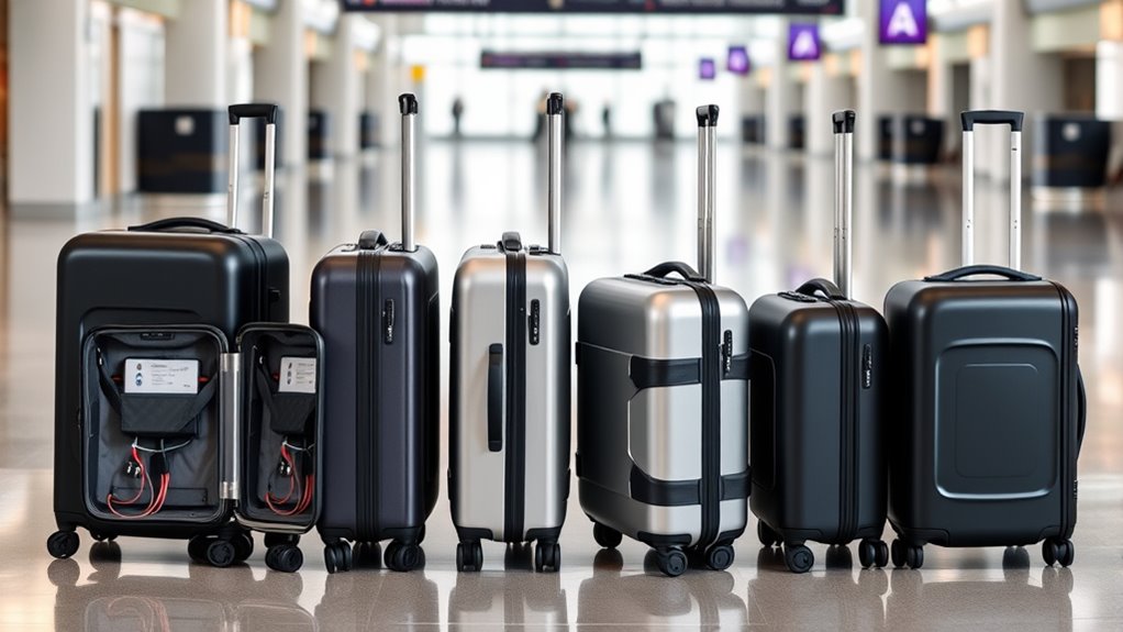 When choosing a carry-on with a removable battery, I consider compatibility with airline regulations and safety standards to avoid surprises at security. I also look for a charging port that’s easy to access and a battery that’s simple to remove when needed. Ultimately, size and weight limits are vital to guarantee I stay within airline requirements without sacrificing capacity.