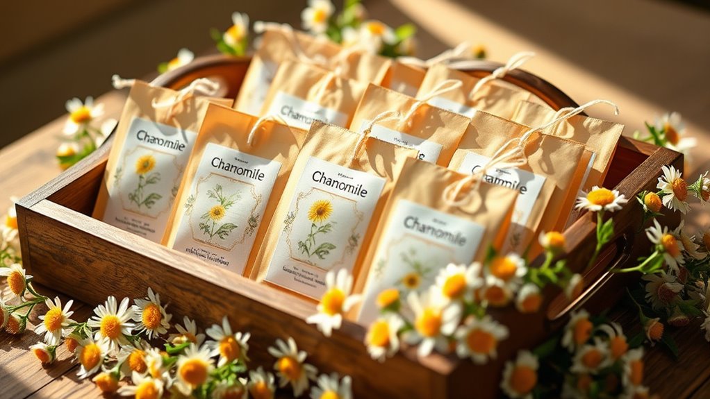 Opting for chamomile tea samplers with sustainable packaging not only benefits the environment but also reflects a mindful approach to consumption. I look for eco-friendly features like biodegradable, recycled, or minimal materials that lower environmental impact and support broader sustainability goals. Packaging free from plastic microplastics, staples, and artificial dyes aligns with my eco-conscious values and ensures safer disposal. Recyclable or compostable tea bag envelopes and boxes help conserve resources and make waste management easier. Minimal packaging designs that reduce waste and carbon emissions demonstrate a brand’s commitment to sustainability. Certifications like FSC, Rainforest Alliance, or Carbon Neutral further confirm responsible practices. Choosing such packaging shows respect for the planet while enjoying your calming chamomile experience.