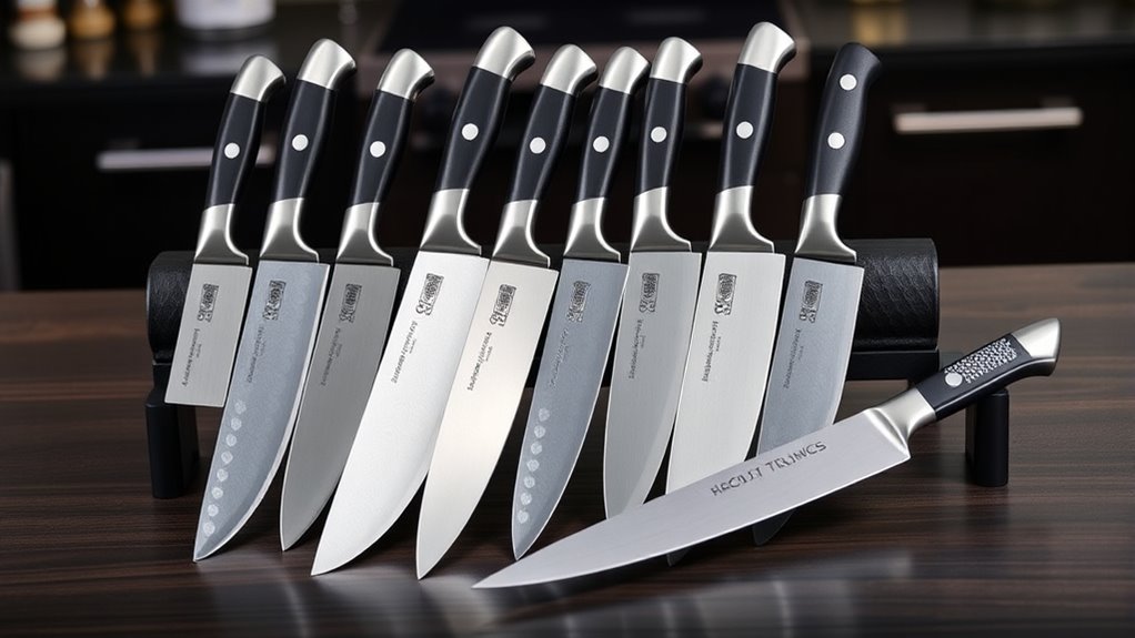 Selecting the right chef knife set hinges considerably on the quality of its blade material, as it determines sharpness, durability, and resistance to corrosion. High-quality blades are usually made from high-carbon stainless steel, offering a good balance of edge retention and rust resistance. The hardness, measured on the Rockwell scale (typically 56-58 for premium knives), directly affects how well the blade maintains its sharpness. Forged blades are generally stronger and less prone to chipping than stamped ones, which tend to be thinner and lighter. A fine grain structure in the material allows for a sharper edge and easier honing. Additionally, alloy elements like chromium, molybdenum, and vanadium boost rust resistance and toughness, ensuring your knives stay sharp and reliable through heavy use.