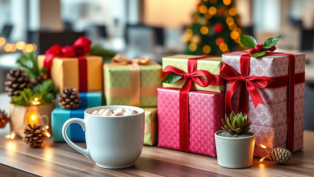 Since presentation can transform a simple gift into a memorable gesture, paying attention to how you wrap and display your coworker’s gift makes a big difference. Attractive packaging, like decorative wrapping, ribbons, or gift bags, instantly elevates the gift’s appearance and adds a touch of thoughtfulness. Including a personalized gift tag or note shows you care and makes the gesture more meaningful. Choosing items in coordinated or festive colors creates a visually appealing display that catches the eye. Additionally, carefully arranging or layering items within a box or basket can make the presentation more inviting and polished. Remember, a well-presented gift not only looks better but also leaves a lasting positive impression, showing your coworker that you put effort into their holiday surprise.