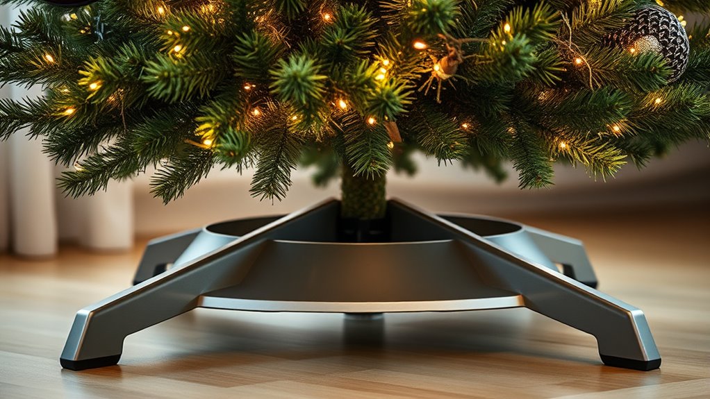 Looking for the best Christmas tree stands that keep your tree secure, stable, and beautiful? I recommend considering options made from durable materials like steel or heavy-duty plastic with anti-slip feet and wide supports. Whether you prefer manual or remote-controlled rotation, or water reservoirs for freshness, there’s a stand to fit your needs. Keep in mind size limits and setup ease. If you want to discover the top picks and what makes them stand out, keep going—there’s plenty to explore.