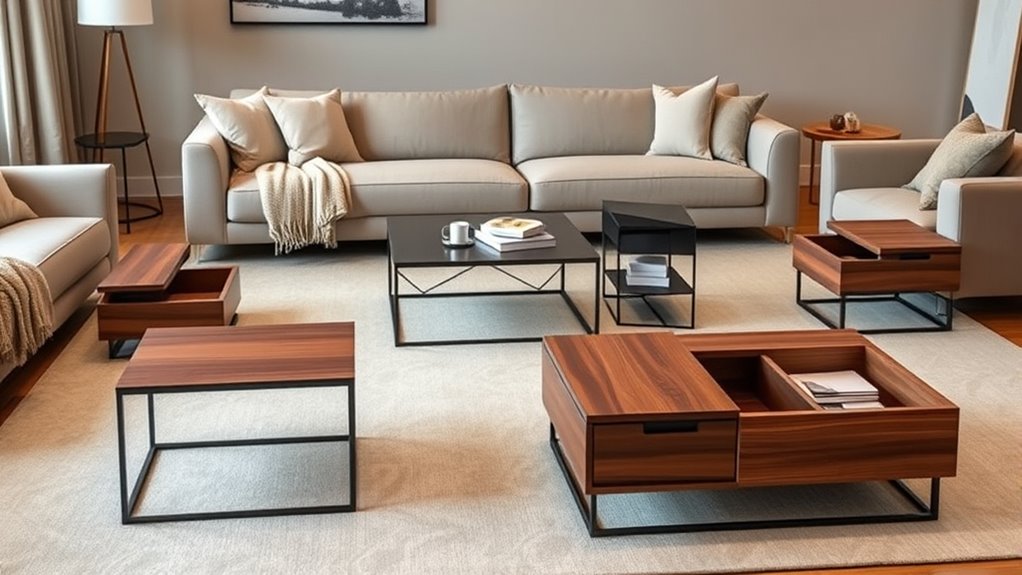 Choosing the right coffee table with storage means evaluating how much you need to store and what kind of access works best for your lifestyle. I start by appraising the volume of items I want to keep nearby, like books, remotes, or blankets, to determine the necessary storage capacity. I also consider whether I prefer hidden compartments for a clean look or open shelves for quick access. Measuring my available space helps me avoid a table that’s too bulky or too small. Versatility matters too—adjustable shelves or multiple compartments can adapt to different needs. Ultimately, I match the storage capacity to my daily routines, ensuring I have enough space without sacrificing style or functionality in my living area.