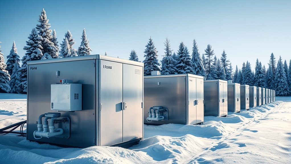 To guarantee dependable operation in cold environments, I consider the specialized chemistry of lithium batteries, like lithium iron phosphate (LiFePO4), which retains capacity better at low temperatures. Battery performance can drop markedly below freezing, often losing 20-50% of capacity depending on the chemistry and design. To counteract this, many models incorporate internal heating elements or insulation, helping preserve efficiency and prolonging lifespan in cold conditions. For temperatures below -4°F (-20°C), pre-warming or external heat sources are often necessary to prevent capacity loss and ensure safety. When choosing a power station for cold climates, I always check the manufacturer’s specified minimum operating temperature, opting for models rated for -4°F to -20°F to guarantee reliable, consistent performance when it’s coldest outside.