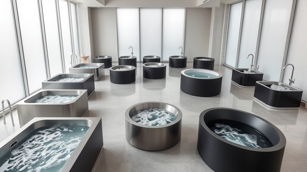 Choosing the right size and capacity for your cold plunge tub is essential to maximize its benefits. The size determines whether you can fully immerse your body or only parts, affecting recovery. Capacity, measured in gallons or liters, influences how long the water retains its cold temperature and how stable it remains during use. For full-body immersion, a tub should hold at least 100 gallons; smaller tubs may only cover your legs or waist, limiting effectiveness. Inflatable or portable options typically have capacities around 50 to 120 gallons, perfect for limited space or occasional use. Selecting a size that fits your body size and available space ensures comfort and ideal cold therapy, making your recovery sessions more effective and enjoyable.