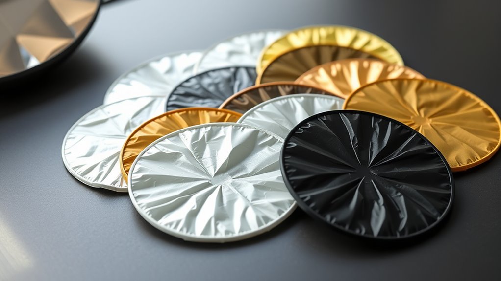 Choosing the right reflective surface material is essential because it directly influences the brightness, color accuracy, and overall quality of your lighting. Aluminum surfaces offer high reflectivity—up to 90%—and durability, making them perfect for professional use. Coated fabrics, like white or silver, provide softer, more diffused light, ideal for portrait work or when gentle illumination is needed. Metallized films or foils are lightweight and highly reflective, making them versatile for various lighting effects in 5-in-1 reflectors. The material also impacts environmental resistance; some surfaces are designed to resist fading, moisture, and scratches, ensuring longevity. Selecting the appropriate material depends on whether you prioritize brightness, diffusion, or durability, helping you achieve the perfect lighting setup for any shoot.