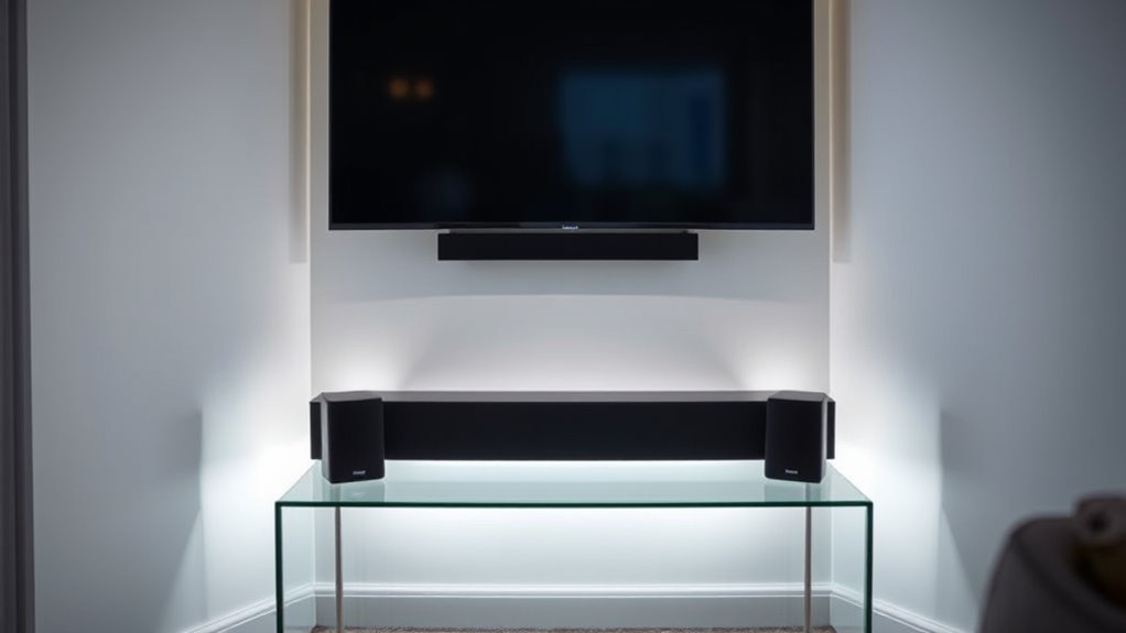 I recommend placing your soundbar centrally below or above your TV, ensuring it’s unobstructed for ideal sound. Keep it away from corners and reflective surfaces that can distort audio. Elevate it slightly if possible, and angle it toward your seating area. Also, consider wall mounting if space is tight, and experiment with placement to find the sweet spot that delivers the clearest, most immersive sound in your small space.