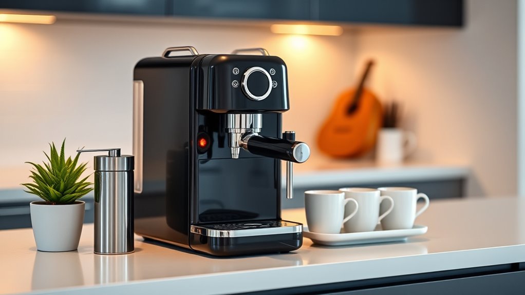 Maintaining a compact espresso machine properly guarantees it runs smoothly and ensures each cup tastes great. Regular descaling and cleaning of the water tank and steam wand prevent mineral buildup that can clog components or reduce performance. Many machines come with automatic cleaning cycles, but some require manual descaling with specific solutions—sticking to manufacturer recommendations is key. Properly cleaning the drip tray and filter components keeps the machine hygienic and prevents blockages that could impact brewing quality. Routine inspection and replacement of seals and gaskets help prevent leaks and maintain pressure integrity. Following the recommended maintenance schedule and using the right cleaning products guarantees your espresso machine stays in top shape, delivering consistent, high-quality coffee every time.