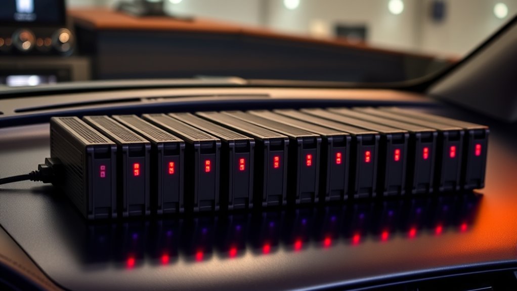 Selecting the right port options is vital to guarantee your inverter can handle all your devices efficiently. Look for models with multiple USB ports, including USB-C and USB-A, to support fast charging for phones, tablets, and other gadgets simultaneously. Dual AC outlets are a must, allowing you to power larger electronics like laptops or small appliances. Make sure the ports can deliver high wattage outputs, such as 24W or 65W USB-C, to meet device requirements. Compatibility with your vehicle’s 12V outlets—whether cigarette lighter sockets or dedicated car sockets—is essential for proper power delivery. Additional features like LED indicators or voltage displays can improve usability by helping you monitor the inverter’s power status easily. These port options ensure versatility and reliable performance on the go.