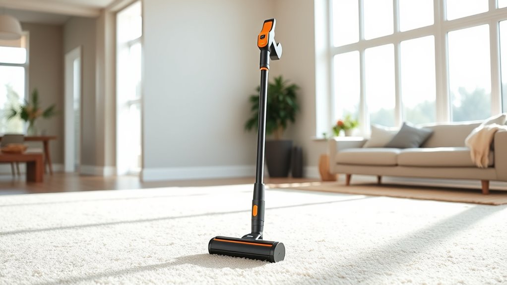 When selecting a cordless stick vacuum for a large house, it’s important to think about how you’ll store and charge it to keep your cleaning routine smooth. Opt for models with wall-mounted charging docks to keep everything organized and guarantee quick access when you need it. Removable, rechargeable batteries are a game-changer—they let you swap in a fresh battery for extended cleaning without waiting for recharges. Consider the size and design of the dustbin too; a manageable, easy-to-empty bin fits better in your storage space and simplifies maintenance. Self-standing vacuums are convenient, allowing you to pause and continue cleaning without leaning or mounting. Finally, look for lightweight, compact designs that are easy to store in closets or small spaces while still providing ample cleaning power.