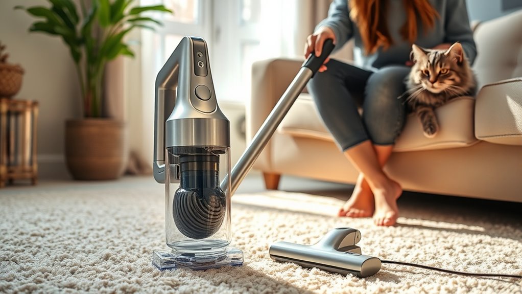 If you’re tired of battling pet hair, choosing the right cordless vacuum can make all the difference. Did you know that 65% of pet owners say their vacuum’s suction power directly impacts their cleanup success? By selecting a model with strong suction, tangle-free brushes, and good battery life, you’ll make pet hair messes a thing of the past. Trust me, the right tool will save you time and stress—happy cleaning!