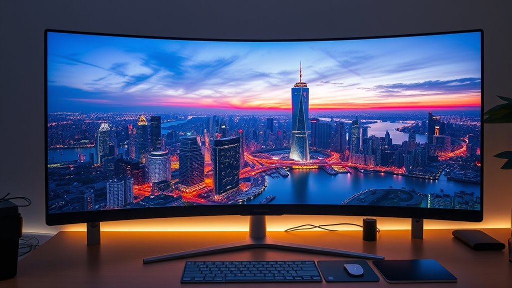 Higher resolution displays like 4K and ultrawide 5K substantially enhance image sharpness and detail, making immersive experiences more realistic. With higher pixel density, text becomes crisper, and visuals gain clarity—crucial for creative work and detailed gaming. Wide color gamuts like sRGB 100% or DCI-P3 95% boost color accuracy and vibrancy, creating more lifelike visuals. HDR support, such as HDR400 or HDR10, adds contrast and depth, making scenes more engaging. Additionally, a low pixel response time and high refresh rate, like 1ms and 120Hz or above, reduce motion blur and ghosting, ensuring smooth, fluid images during fast-paced action. Prioritizing resolution and image clarity helps deliver the immersive, detailed viewing experience that makes curved monitors truly stand out.