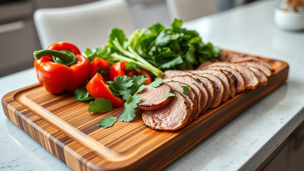 To prevent cross-contamination between raw meat and vegetables, it’s crucial to use separate cutting boards for each. This simple step greatly reduces the risk of bacteria transfer. Color-coded or labeled boards help quickly identify which surface to use for meat and which for produce, minimizing accidental swaps. Non-porous materials like stainless steel or BPA-free plastic are excellent choices because they’re less likely to harbor bacteria and are easier to sanitize thoroughly. Regular cleaning and disinfecting, especially after working with raw meat, is essential to eliminate harmful pathogens. Adding features like juice grooves or built-in zones can contain liquids and residues, further preventing cross-contact during food prep. These considerations help keep your kitchen safer and your food properly prepared.