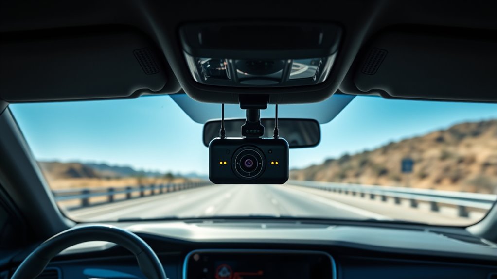 Are you aware of how safety features can substantially enhance your dash cam’s protection? Look for models with G-sensors that automatically lock footage during collisions, ensuring essential evidence isn’t overwritten. Parking mode features, like time-lapse or motion detection, allow you to monitor your vehicle when parked, providing peace of mind. Loop recording is indispensable, as it continuously captures footage without losing important incidents. Some advanced models offer safety alerts such as lane departure warnings or forward collision warnings, adding an extra layer of security. Also, check for impact detection and automatic emergency locking to preserve critical footage during accidents. These safety features not only protect your vehicle but also help you gather essential evidence if you’re ever involved in a dispute or incident.