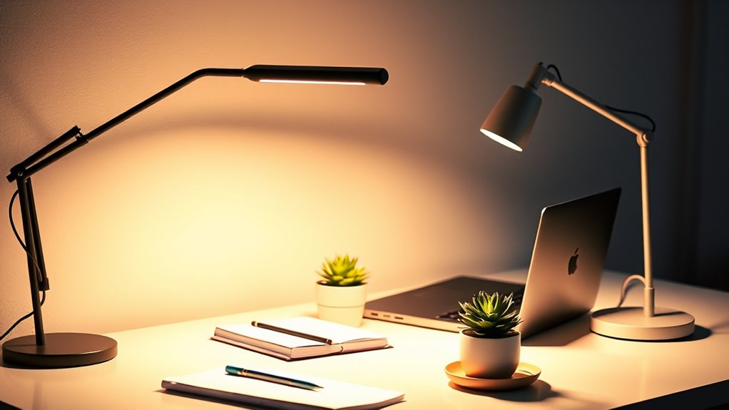 Choosing the right desk lamp means paying close attention to its brightness adjustment options, as these directly impact your comfort and productivity. Look for lamps with stepless dimming features, so you can fine-tune brightness smoothly without fixed levels. Multiple brightness settings, like 1% to 100%, give you precise control for different tasks. Touch controls or rotary knobs make adjusting the light quick and effortless, saving you time. Also, check if the lamp has a memory function that remembers your preferred brightness level—no need to readjust each time you turn it on. Clear, accessible controls are essential for quick changes, especially when switching between tasks. Prioritizing these features ensures a customizable lighting experience that enhances both comfort and efficiency.