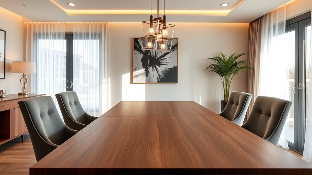 To guarantee your dining room table set complements your overall decor, it’s essential to contemplate its style and how it fits with the existing design elements. I pay close attention to the decor style, whether modern, traditional, industrial, or minimalist, and choose a table that aligns seamlessly. The color palette and materials, like wood, glass, or metal, help create a cohesive look. I also consider the table’s shape—rectangular, round, or square—to match the room’s layout and aesthetic preferences. Details matter, too; tufted chairs suit a classic vibe, while sleek lines fit a contemporary space. Ensuring the set’s style integrates well with other furniture pieces maintains visual harmony and elevates the room’s overall ambiance.