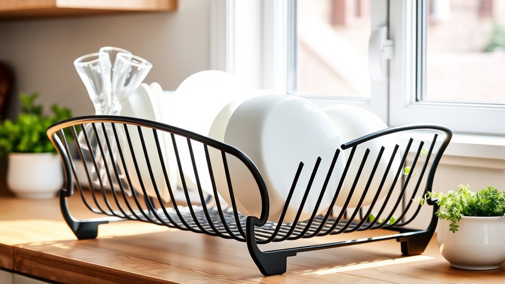 To keep my dish drying rack clean and in great shape, I regularly wipe it down with a damp cloth and mild soap. I avoid harsh chemicals that could damage the material. For deeper cleaning, I sometimes soak it in warm water with vinegar or baking soda. I also make sure to dry it thoroughly after cleaning to prevent rust or mold, ensuring it stays both functional and stylish.