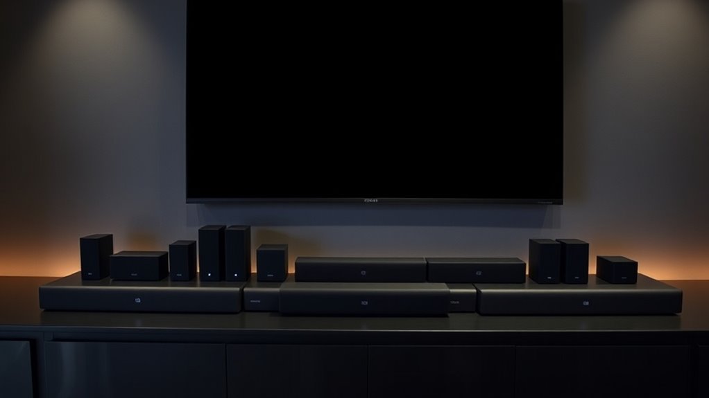 Staying within a $500 budget means you’ll need to focus on entry-level Dolby Atmos soundbars that deliver essential features without the extra bells and whistles found in higher-end models. This price range limits you to models with moderate wattage and simpler configurations, often just 3.1 or 5.1 channels, which still provide immersive sound without the complexity of more advanced setups. Many soundbars under $500 include built-in subwoofers and support popular streaming services, ensuring good value. However, they may lack premium features like up-firing speakers or room calibration. Connectivity options tend to be more basic, favoring Bluetooth and HDMI ARC/eARC over advanced Wi-Fi or multi-room capabilities. Balancing features and cost is key to finding a model that offers the best sound for your budget.