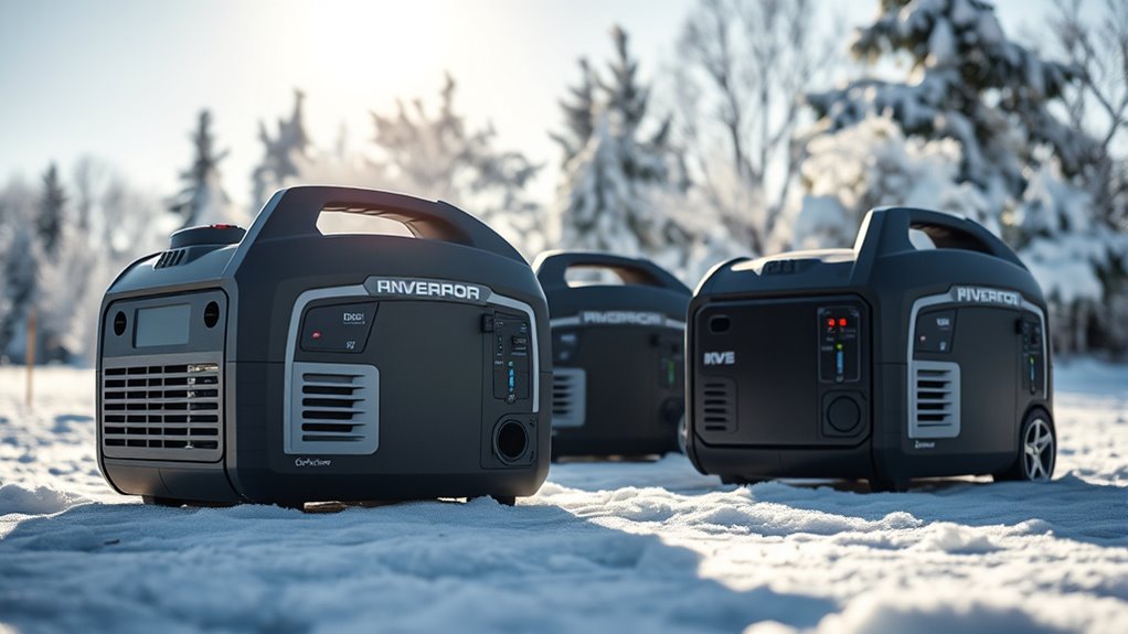 Choosing a dual fuel inverter generator for winter requires careful attention to its cold weather features, as low temperatures can challenge engine startup and operation. Look for models with enhanced engine block insulation and cold-start technology, which help guarantee reliable starts in freezing conditions. Using higher-quality oil that remains viscous at sub-zero temperatures is essential for proper lubrication and engine health. Batteries with sufficient cold cranking amps (CCA) are indispensable for electric start systems, preventing failure during cold snaps. Additionally, features like fuel line heating or heated carburetors help maintain fuel flow and prevent gelling. Proper storage and pre-start warm-up procedures are also critical to keep the generator running smoothly and to protect it from the harsh effects of winter weather.