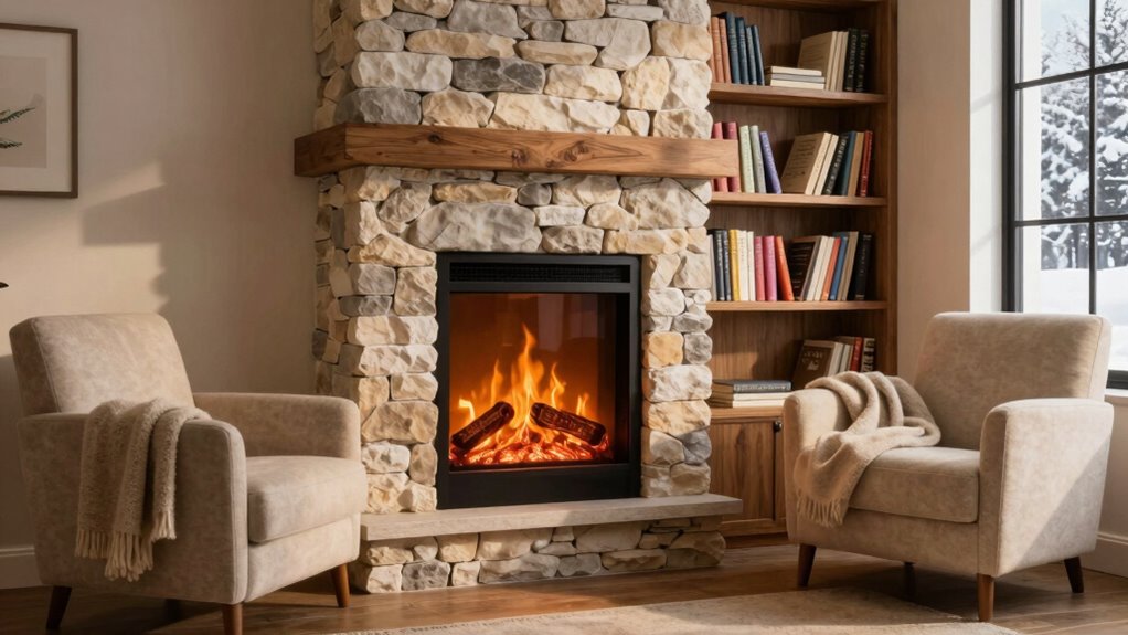 Selecting an electric fireplace that matches your reading room’s style involves considering its customization options and visual features. I look for models that offer a variety of flame color options and brightness levels, so I can set the perfect mood. Customizable media beds, like crystals or driftwood, add realism and enhance the room’s aesthetic. Adjustable flame speeds and fire bed intensity let me tailor the ambiance to my liking, whether I want a subtle glow or a more vibrant display. Multiple lighting effects, including multicolor flames and LED accent lighting, help match different decor styles. I also prioritize units that operate flames and heat independently, allowing me to enjoy the visual warmth without affecting the room’s temperature.